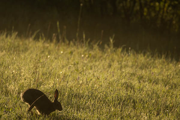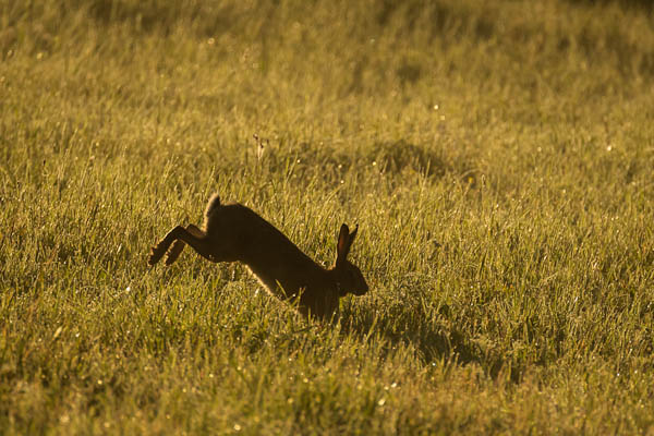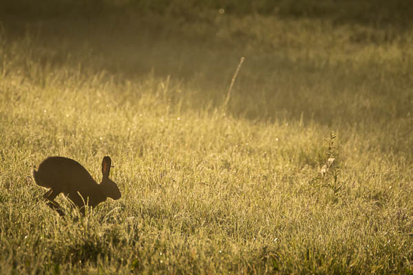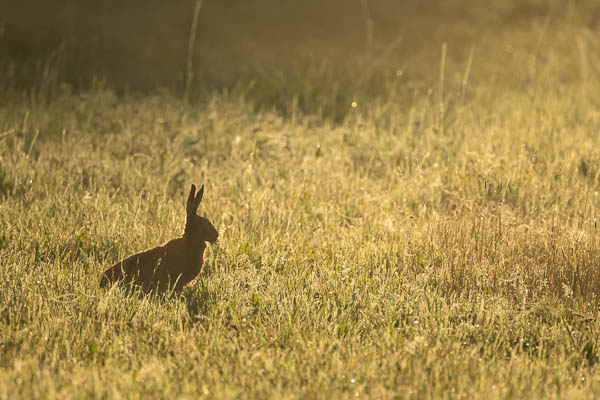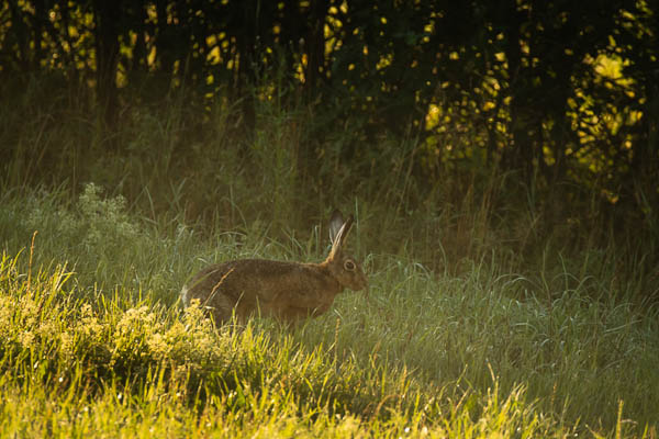 Under soluppgången hade jag inte bara rådjur på spelplanen utan även en hare som bilderna nedan visar. Haren satt en bit bort när jag upptäckte den. Efter ett tag skuttade den precis framför gömslet.